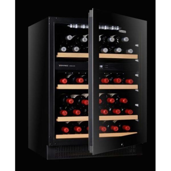 Vintec Noir WFG45 SG 2e BK vinskap kan justeres i stedet for en 60 cm. skapmodul. Vintec Noir WFG45 SG 2e BK vinskap har 2 temperatursoner hvor temperaturen kan stilles inn mellom 5-10°C på toppen og mellom 10-18°C i bunnen. Vinskapet har plass til totalt 45 flasker. 4 stk inkludert. uttrekkbare hyller og 1 stabel med trehyller. Vinskapet har UV-beskyttende glassdør i minimalistisk design med integrert usynlig dørhåndtak.